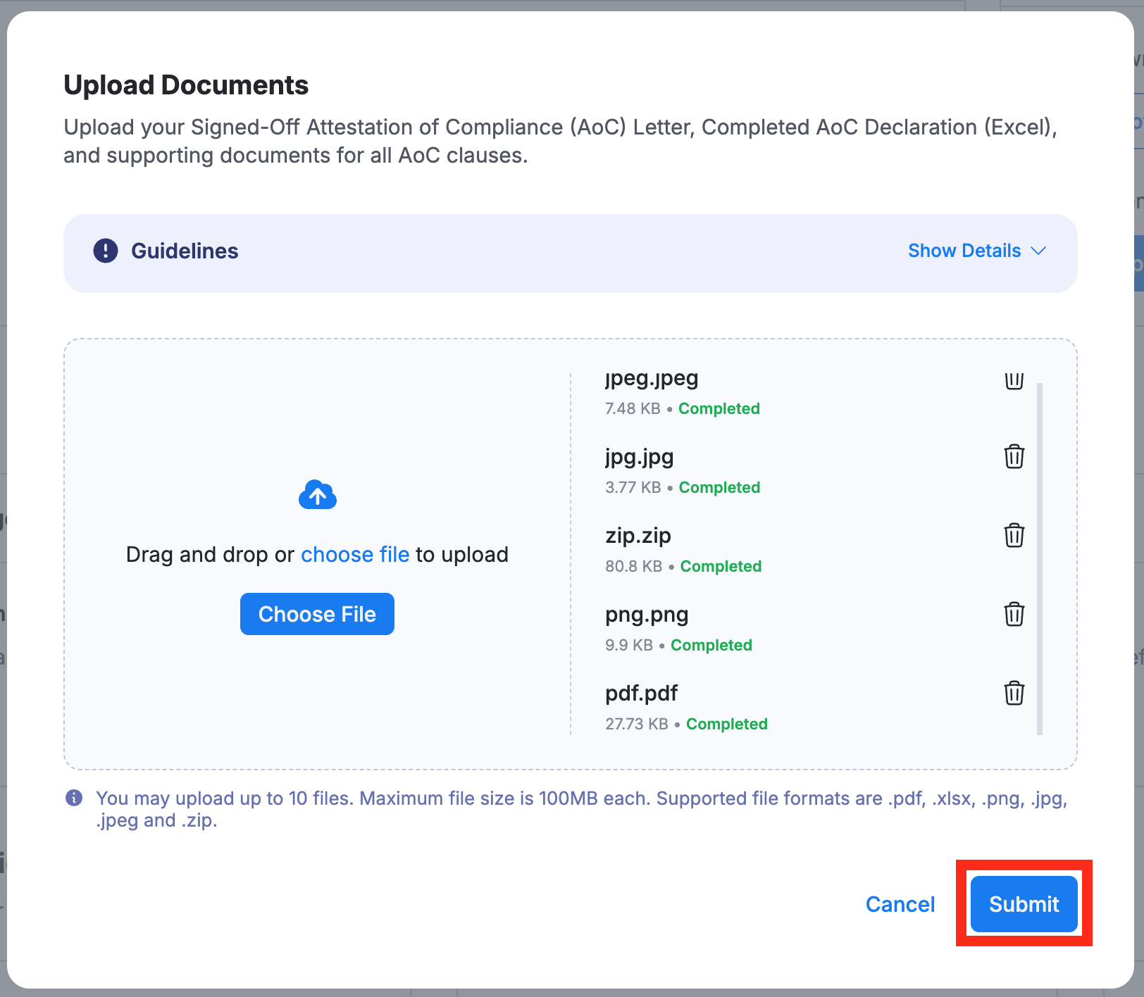 After selecting all necessary files, click Submit.